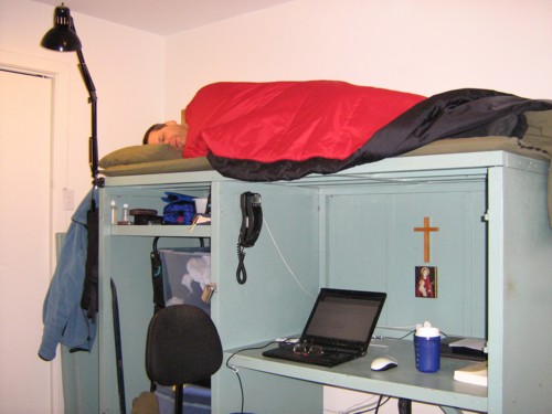 An unplanned use for the chair-table combo is weak-man's chinups: since the top of the chair is at the same height as the tabletop, I can put a solid bar in between both, put two bar clamps on the chair top to prevent the bar from rolling off, then use the bar for easier chinups (i.e. not picking myself off the ground, because part of my body weight is still on my legs resting on the ground). It's easy to find a place to do situps and pushups, but chinups are usually much harder to do in the average appartment.